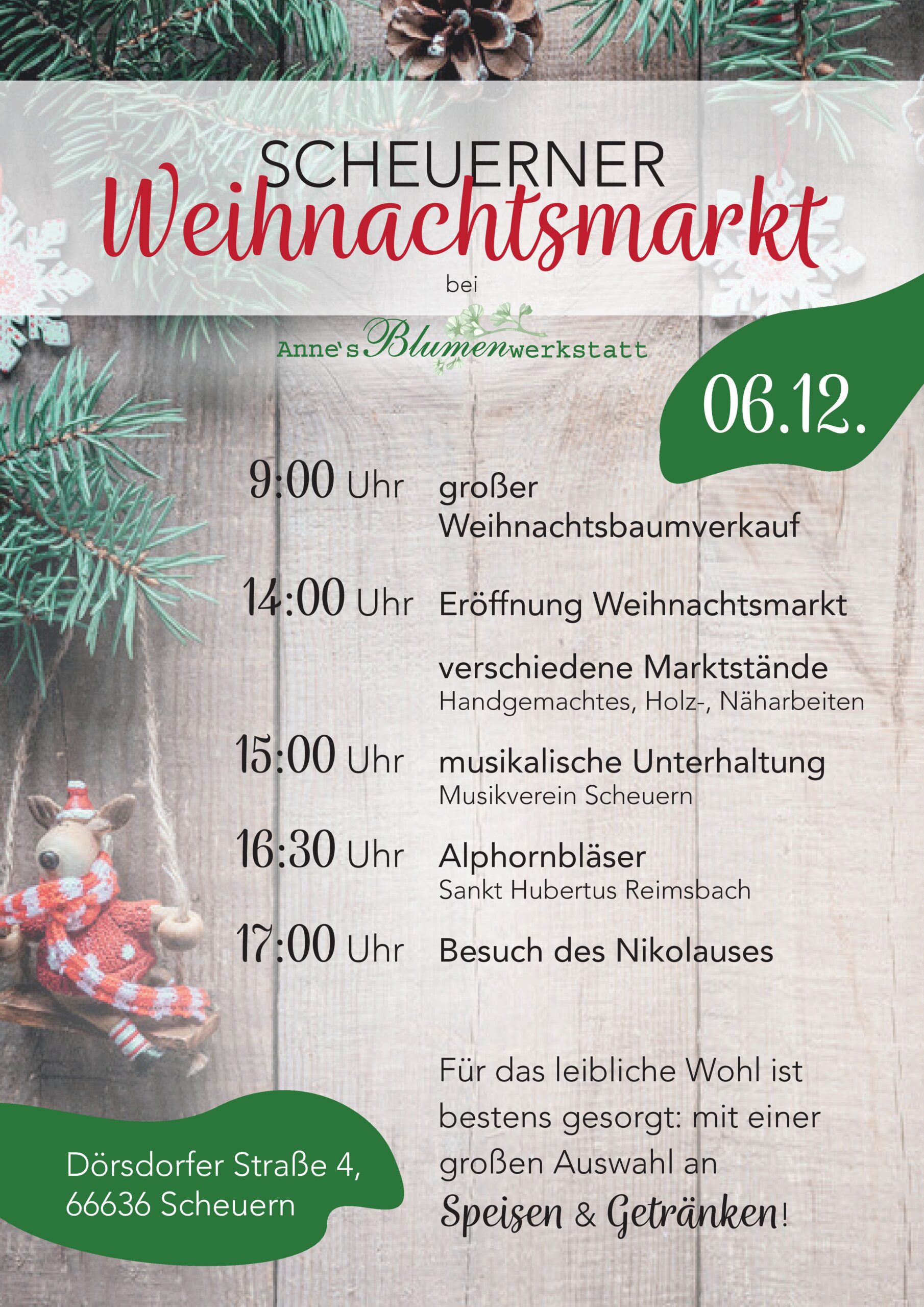 Am Samstag, den 06.12.2025, findet der diesjährige Weihnachtsmarkt in Scheuern statt. Die Eröffnung findet um 14:00 Uhr bei Annes Blumenwerkstatt in der